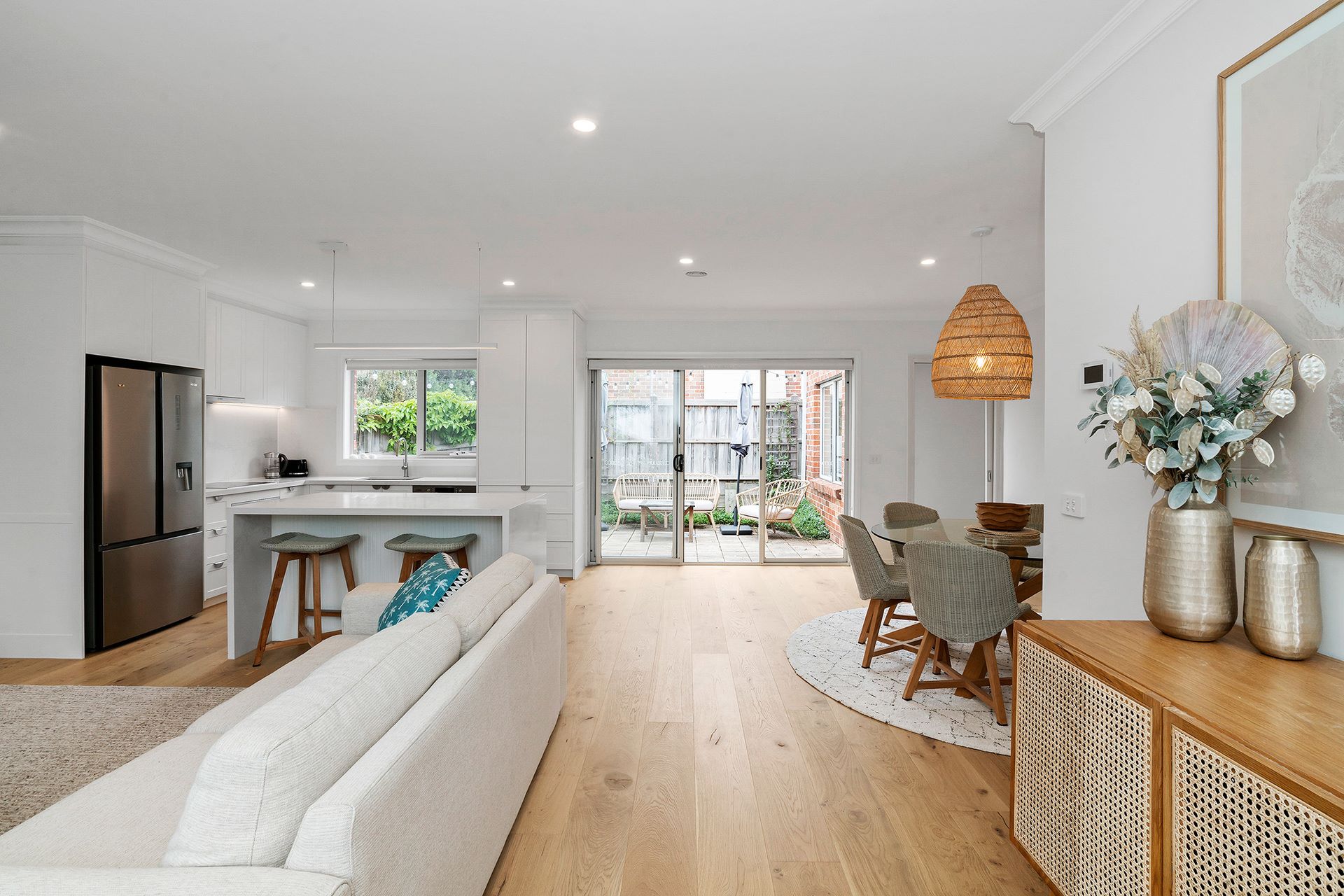 Only 300 metres from Fishermans beach and a morning coffee at Lilo Cafe on the Esplanade plus minutes to Main Street, this three-bedroom single-level townhouse brings together privacy, lifestyle and position - Spacious and light filled open-plan lounge-dining with engineered hardwood flooring leading to an updated kitchen with Caesarstone benches, induction cooktop, under bench oven and dishwasher plus spacious pantry - Enjoy a master bedroom with ample storage and a renovated ensuite, while two other bedrooms offer built in robes and share an updated family bathroom with separate toilet. - The home includes ducted heating & air conditioner plus ceiling fans in all bedrooms - Rear courtyard offers alfresco entertaining and catches the morning sun - Auto double garage with direct internal and courtyard access