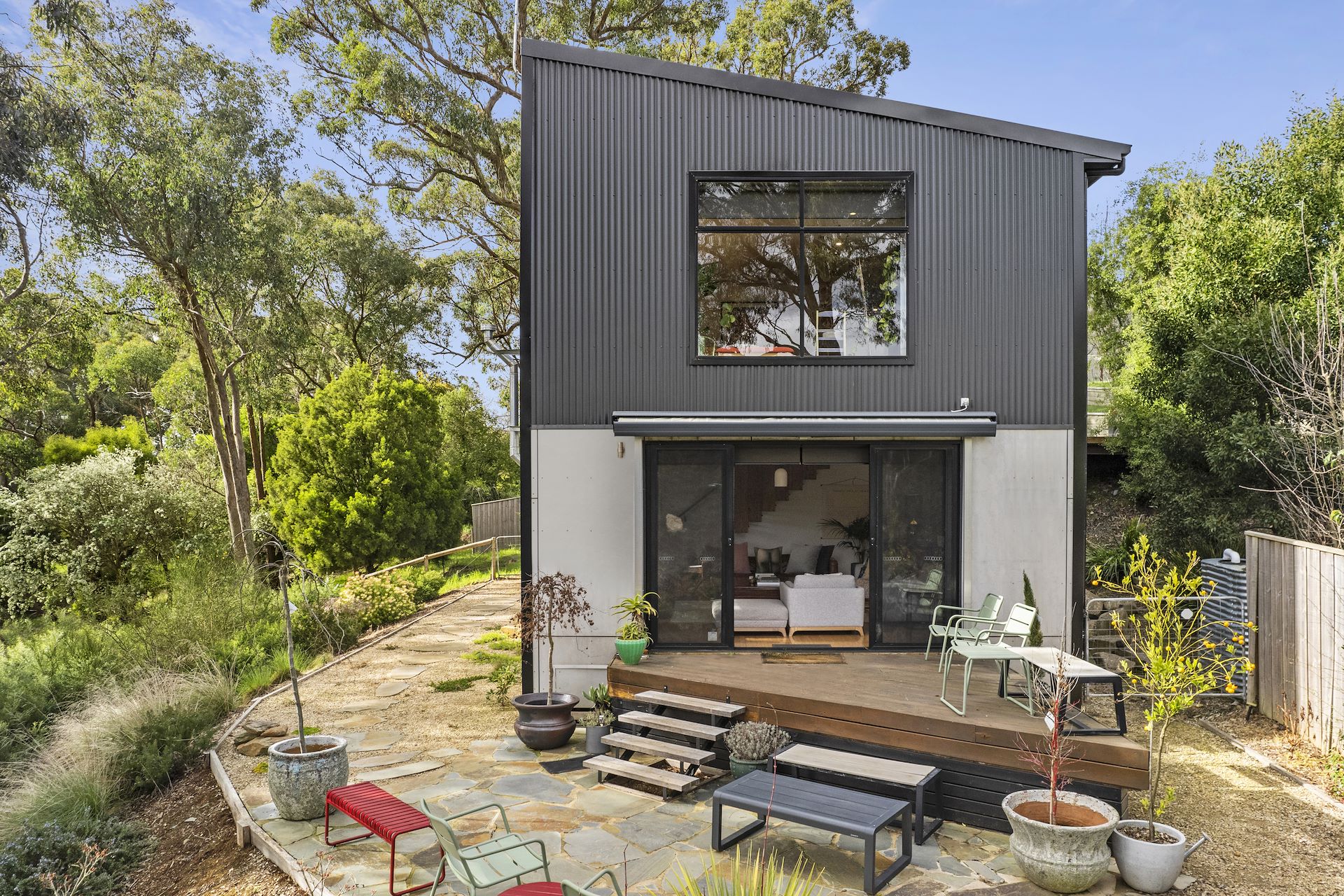 Against the serene backdrop of Wombat State Forest, shaded by towering eucalypts, this idyllic retreat feels deep in the country, yet it's moments to the charming heart of Daylesford. Immersed in calm, quiet, and scenic beauty, this architecturally designed residence creates a truly restorative experience for permanent residents and demonstrates success in the short-term rental market. *Click on the video to see more of this stunning property. A gentle descent into Doctor's Gully provides the initial introduction to this 3-bedroom, 2-bathroom home, with a decked bridge and a striking, robust 1966 Wormald Bros. black fire door granting a unique and inviting entry to the home. Opening out, a light-filled kitchen and dining space boasts large windows that frame expansive forest views more beautiful than any artwork, and a suspended staircase leading to the lower level makes a statement of exceptional craftsmanship and design sophistication. Relaxed and homely, the beautiful living room is warmed by a gas fireplace and embraces the outdoors with a welcome connection to an elevated deck and a crazy-paved terrace that overlooks the spacious back garden. Presented with a lush colour pallet, the three bedrooms include a main bedroom with a walk-in robe and an ensuite, whilst a central bathroom and powder room support the remaining two bedrooms. This peaceful sanctuary's additional features include quality appliances, timber floors, solar panels, double-glazed windows, split system air conditioning systems on both levels, an electric shade awning, and a Euro laundry. At the rear of the property, a gate provides access to the state forest, whilst cafes, boutique shopping and superb dining affairs await in both Daylesford and Hepburn, and the tranquillity of Spa Country offers an array of relaxing experiences ready for your indulgence.