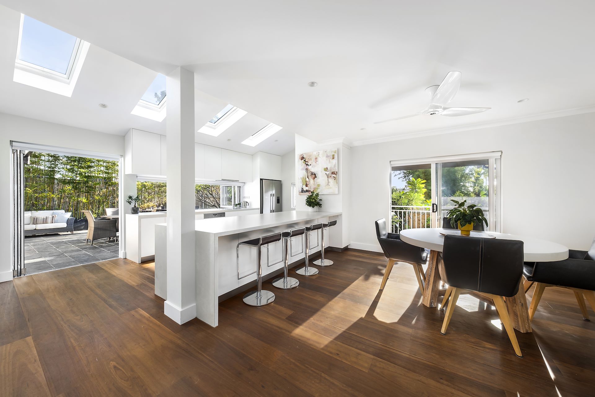 Hidden down a private driveway on 821sqm of near-level landscaped gardens with a sparkling pool, this stunning dual-level residence is crafted for luxurious livability and is designed for spectacular indoor/outdoor entertaining. Showcasing three extensive living and dining spaces plus stool bars on either side of a deluxe stone kitchen that forms the central entertaining hub, it opens to an extensive private rear deck plus a verandah and sundeck overlooking the lawn and tropical pool area. Peaceful, private and perfectly positioned for families, it is a short stroll from primary schools and village shops with Narrabeen Lagoon and beaches only a short breath away. - Generous living room with bay windows to the north plus a cozy gas log fireplace - Glass sliders open to a covered terrace and sundeck plus a covered side terrace - Large dining room, generous family room with wine bar/cabinet opens to rear deck - Miele equipped Caesarstone kitchen, induction cooktop and integrated dishwasher - Stool bar by the dining room and bi-fold windows open to stool bar on the deck - Extra-large bedrooms with built-ins, the main has a walk-in robe and ensuite - Sleek contemporary bathrooms, main has heated flooring, mud room by the garage - Remote opening skylights above the kitchen, timber, tiled and carpeted flooring - Ducted air conditioning upstairs, plantation shutters plus a ducted vacuum system - Sunny near level north lawn and pool framed by tropical palms and frangipanis - Remote-controlled double lock-up garage with internal access, security alarm