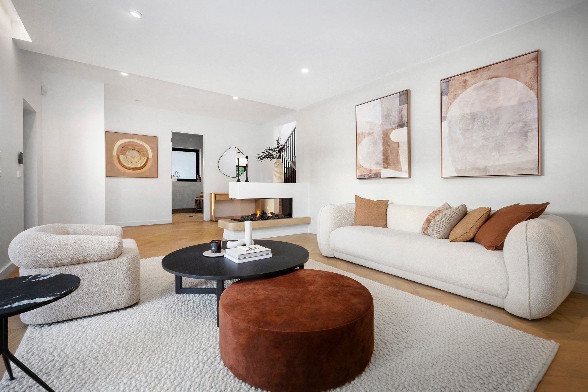 In the first living room, the pair opted for elegant Laminex wall panelling and a high-end Venetian plaster finish to create a timeless, textural feel, making it the perfect haven to relax and unwind. Complete with a stunning Stoke fireplace, this really is one of the cosiest and comfiest areas of the home.